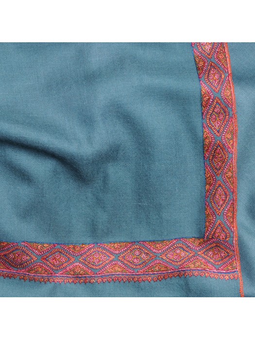 Dieser außergewöhnliche Pashmina XXL in der Farbe der Zeit changiert zwischen Blau und Grün in einem unwiderstehlich tiefen Farbton, der durch ein feines, handgefertigtes Stickband in warmen Ocker- und Rottönen noch verstärkt wird. Kuschelig und wärmend, der perfekte Kokon, auf den Sie diesen Winter nicht verzichten möchten...