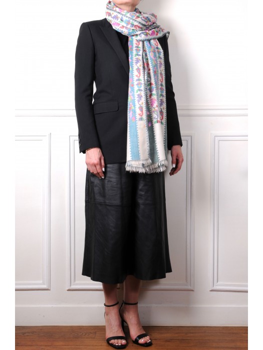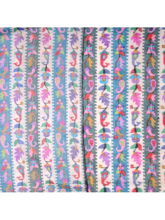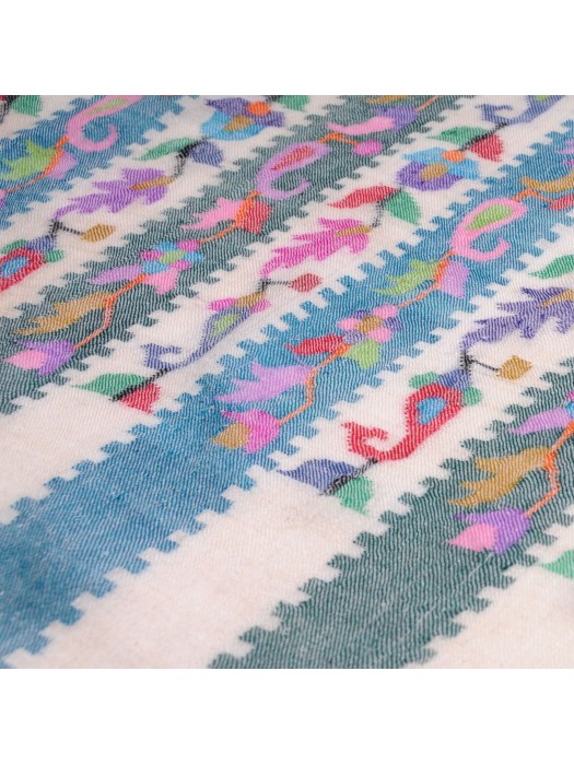 KANI-Schal aus echtem Pashmina aus Ladakh, 100% handgewebterKaschmir. Dieser an Weichheit, Wärme, Leichtigkeit und Feinheit unvergleichliche Schal wurde von einem Kashmiri-Handwerker nach der traditionellen Kani-Technik handgewebt. Auf der Basis einer Köperbindung stellt der Handwerker die Arabeskenmuster nicht mit einem Schiffchen her, sondern indem er kleine Holzstäbchen namens Kanis oder Tujis ineinander verschlingt, um die die farbigen Schussfäden gewickelt werden. Diese Webart, deren Muster ein codiertes Muster wiedergibt, ähnelt einer Tapisserie und erfordert monatelange Arbeit. Es handelt sich um eine sehr alte, prestigeträchtige Handwerkstechnik, für die Kaschmir seit dem 15. Jahrhundert berühmt ist. Heutzutage werden Kani nur noch in den Hochzeitsausstattungen wohlhabender Erbinnen verwendet und von den Großen der Welt getragen.