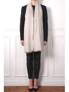 This impalpably light pashmina shawl is adorned in a soft, luminous beige, evoking the warmth of fine sand... Fine gold embroidery inspired by Persian gardens gives ita discreet...