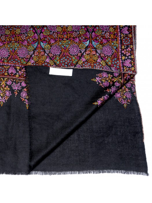 Exceptional black Jamawar pashmina shawl, whose remarkably rich embroidery evokes the sumptuousness of colorful Mughal gardens. Fluid and very soft, this piece features a breathtakingly modern stylized design and will instantly enhance any outfit: a true work of art!
