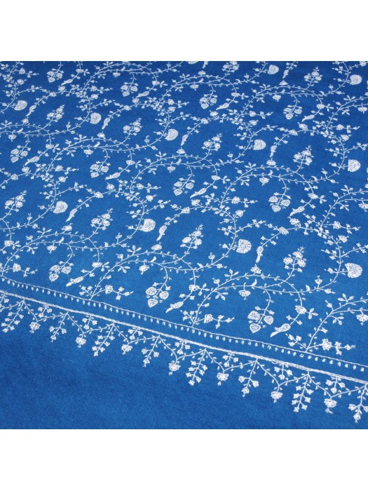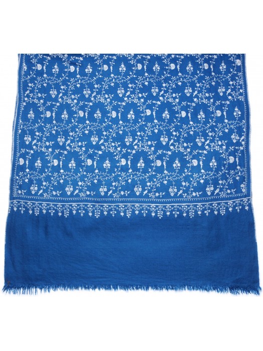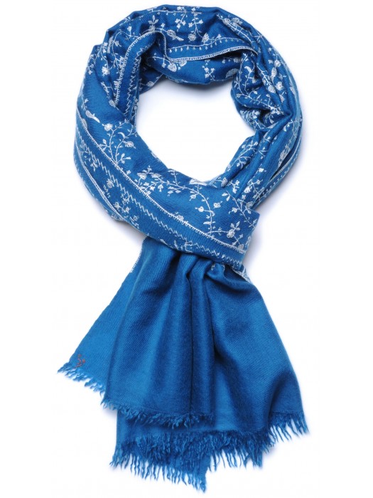 A timeless must-have, the stole in genuine pashmina embroidered with a white floral motif: a marvel of delicacy and softness in pure, hand-woven cashmere in brilliant blue!