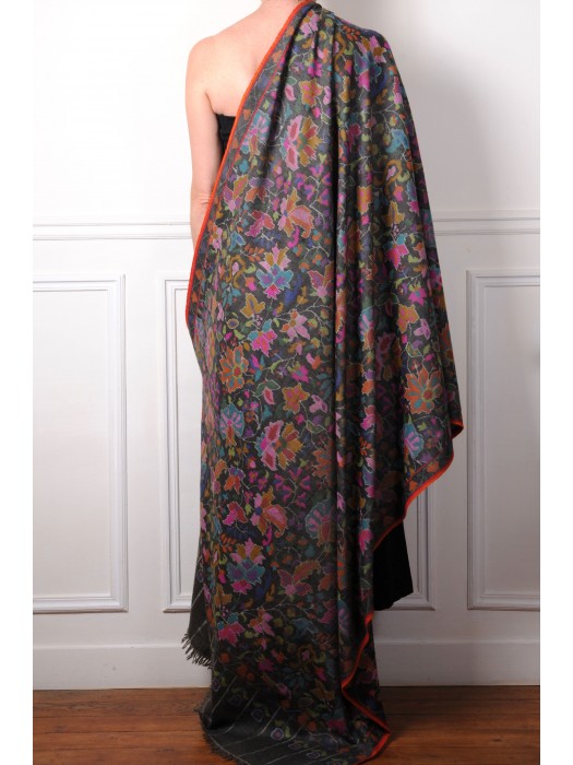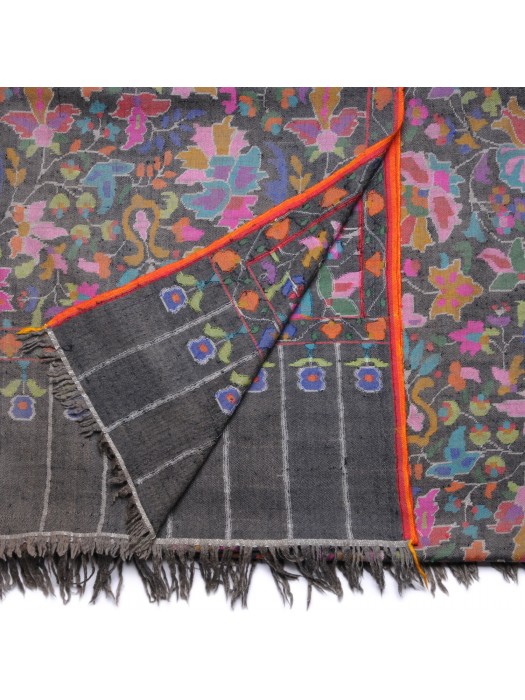 Hand-woven 100% cashmere pashmina shawl from Ladakh. Incomparable in terms of softness, warmth, lightness and finesse, this shawl has been hand-woven by a Kashmiri craftsman using the traditional kani technique. On a twill weave base, the craftsman creates the arabesque motifs not with a shuttle, but by interlacing small wooden sticks called kanis or tujis around which colored weft threads are wound. This weaving, whose motifs reproduce a coded pattern, is akin to tapestry and requires many months of work. It's an ancient, prestigious craft technique that has made Kashmir famous since the 15th century. Nowadays, Kani are reserved for the wedding trousseaux of wealthy heiresses and worn by the great and the good.