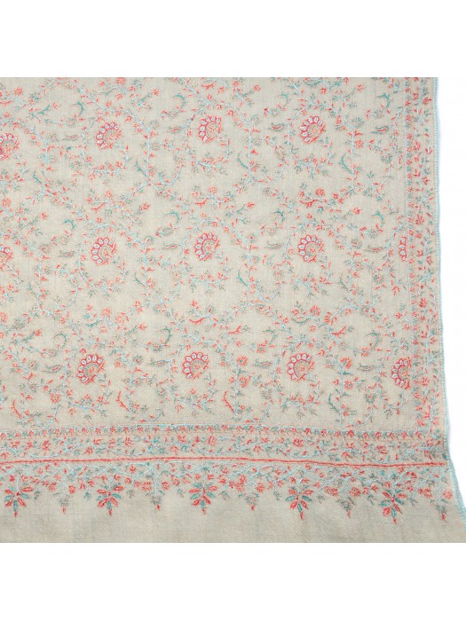 Genuine pashmina shawl 100% cashmere. With no equivalent as it concerns softness, warmth, lightness and finenesse, this shawl is hand-woven by kashmiri craftsmen based on the traditional bird's eye pattern. Wrinkle-free, always warm to wear, this type of shawl made Kashmir valley famous for centuries. Warning this article may be addictive ! Twill effect weaving, sharp edges, full reversible handmade embroideries.