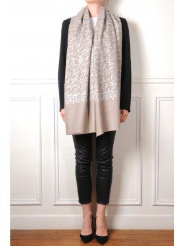 Magnífico bordado que representa un vuelo de mariposas multicolores: toda la maestría de los artesanos cachemires sublima esta soberbia estola de color beige natural,...