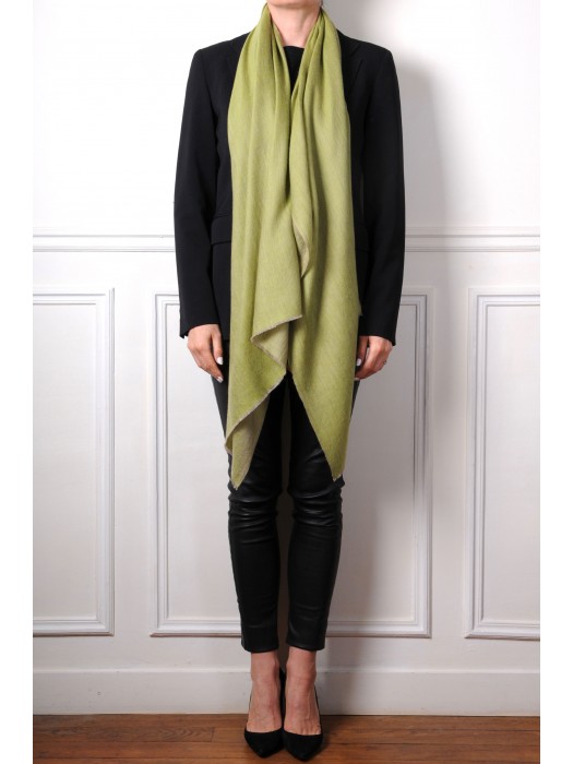 Muy sofisticada, esta auténtica pashmina verde tejida a mano en pura cachemira del Himalaya está adornada con brillantes reflejos moaré.