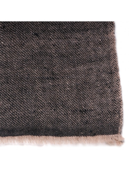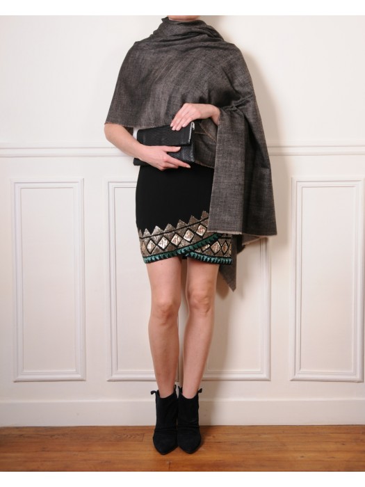 Chal de pashmina 100% cachemira. Incomparable en términos de suavidad, calidez, ligereza y delicadeza, este chal está tejido a mano con el tradicional patrón de ojo de pájaro por un artesano cachemir que tardará 4 días en confeccionar esta pieza de uno por dos metros en su telar de madera. Este tipo de chal, que no se arruga y abriga enseguida, es una marca registrada de Cachemira desde hace siglos. Tenga en cuenta que este artículo puede crear adicción Tejido de sarga reversible por ambas caras para un efecto irisado brillante, una cara negra y otra beige natural, bordes limpios.