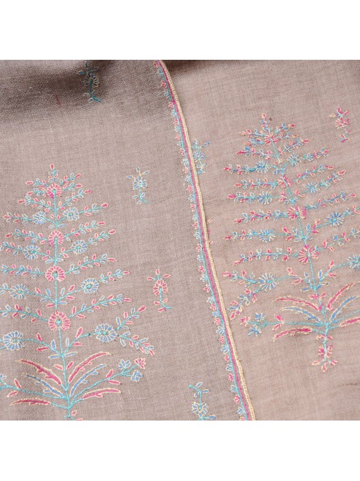 Auténtica estola de pashmina 100% cachemira bordada a mano. Incomparable en cuanto a suavidad, calidez, ligereza y delicadeza, este chal ha sido tejido y bordado a mano por artesanos cachemires mediante técnicas tradicionales. Las pashminas son un elemento básico de Cachemira desde el siglo XV, no se arrugan y dan calor de inmediato.
