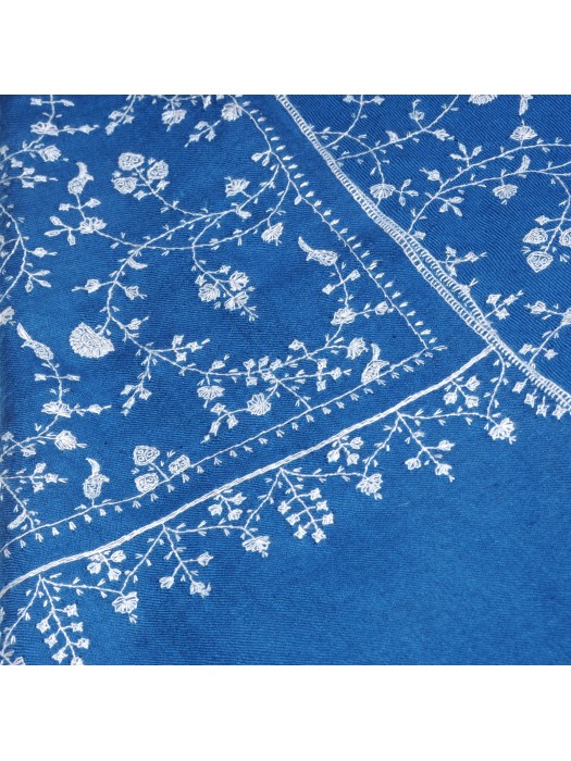 Un must-have atemporal, la estola de auténtica pashmina bordada con un motivo floral blanco: ¡una maravilla de delicadeza y suavidad en pura cachemira tejida a mano en un azul brillante!