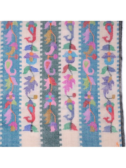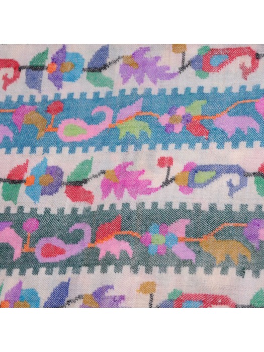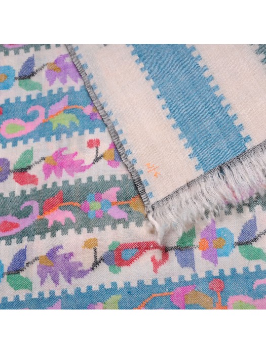 KANI CHAL en auténtica pashmina 100% cachemira tejida a mano en Ladakh. Incomparable en términos de suavidad, calidez, ligereza y delicadeza, este chal ha sido tejido a mano por un artesano cachemir utilizando la técnica tradicional kani. Sobre una base de tejido de sarga, el artesano crea los motivos arabescos no con una lanzadera, sino entrelazando pequeños palos de madera llamados kanis o tujis alrededor de los cuales se enrollan los hilos de colores de la trama. Este tejido, cuyos motivos reproducen un patrón codificado, es similar a la tapicería y requiere muchos meses de trabajo. Es una técnica artesanal muy antigua y prestigiosa que ha dado fama a Cachemira desde el siglo XV. Hoy en día, los kani están reservados a los ajuares de boda de las herederas ricas y los lucen los grandes y los buenos del mundo.