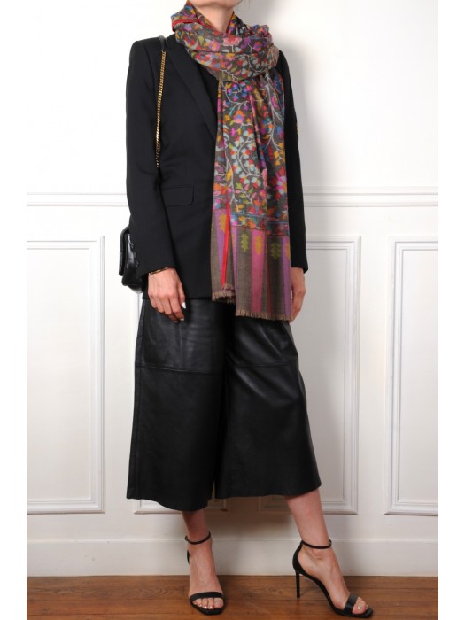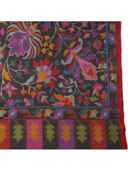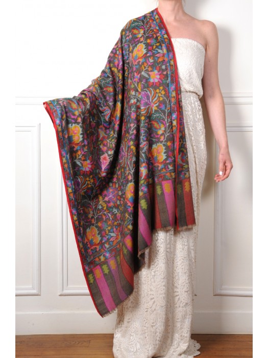 Châle en véritable pashmina du Ladakh 100% cachemire tissé à la main. Incomparable en terme de douceur, chaleur, légèreté et finesse, ce châle a été tissé à la main par un artisan kashmiri selon la technique traditionnelle du kani. Sur une base d'armure twill, l'artisan réalise les motifs d'arabesques non pas avec une navette, mais en entrelaçant des petits bâtonnets de bois nommés kanis ou tujis autour desquels sont enroulés les fils de trame colorés. Ce tissage, dont les motifs reproduisent un modèle codé, s'apparente à de la tapisserie et nécessite de longs mois de travail. C'est une technique artisanale prestigieuse très ancienne qui fait la renommée du Kashmir depuis le 15ème siècle. De nos jours les Kani sont réservés aux trousseaux de mariage des héritières fortunées et portés par les grands de ce monde.