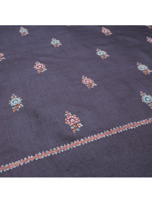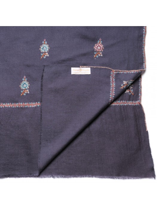 Châle en véritable pashmina 100% cachemire. Incomparable en terme de douceur, chaleur, légèreté et finesse, ce châle a été tissé et brodé à la main par des artisans cachemiri selon les techniques traditionnelles. Infroissable, immédiatement chaud au porter, ce type de châle fait la renommée du Cachemire depuis des siècles. Tissage twill, brodé à la main de fils de coton selon un motif booti dar.