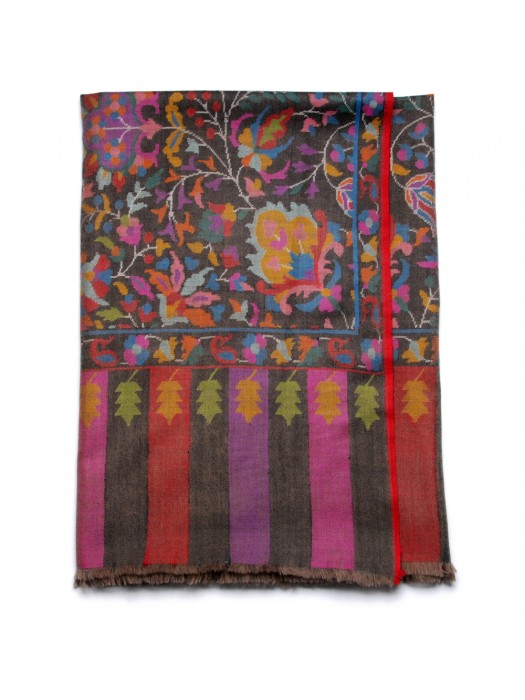 Autentico scialle in pashmina 100% cashmere tessuto a mano dal Ladakh. Incomparabile in termini di morbidezza, calore, leggerezza e finezza, questo scialle è stato tessuto a mano da un artigiano kashmiro secondo la tradizionale tecnica kani. Su una base di armatura a saia, l'artigiano crea i motivi arabescati non con una navetta, ma intrecciando piccoli bastoncini di legno chiamati kanis o tujis attorno ai quali si avvolgono i fili di trama colorati. Questa tessitura, i cui motivi riproducono uno schema codificato, è simile all'arazzo e richiede molti mesi di lavoro. È una tecnica artigianale molto antica e prestigiosa che ha reso famoso il Kashmir fin dal XV secolo. Oggi i Kani sono riservati ai corredi nuziali di ricche ereditiere e indossati dai grandi e dai buoni del mondo.