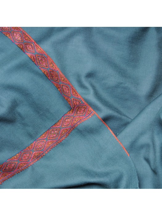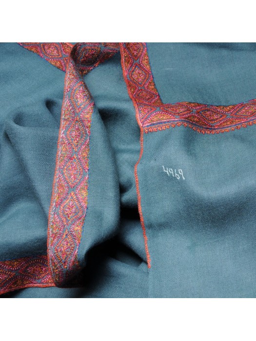 Deze uitzonderlijke XXL Pashmina in de kleur van de tijd, aarzelt tussen blauw en groen in een toon van onweerstaanbare diepte, nog versterkt door een fijn handgeborduurde band in warme oker- en roodtinten. Zacht en troostend, de perfecte cocon waar je deze winter niet zonder wilt...